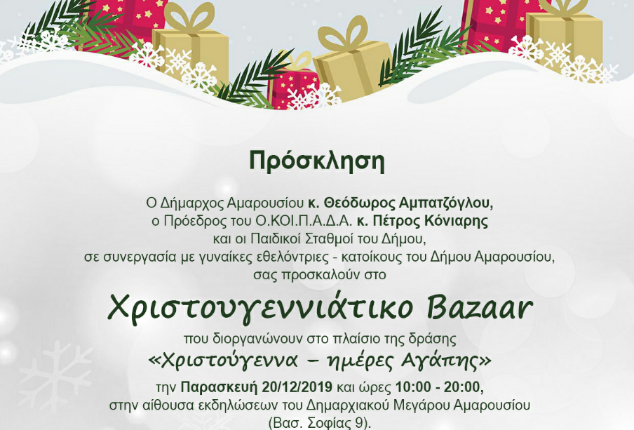 Μεγάλη η συμμετοχή των εμπόρων και επαγγελματιών του Δήμου Αμαρουσίου στο Χριστουγεννιάτικο Bazaar, για την ενίσχυση του Κοινωνικού Παντοπωλείου, προσφέροντας πολλά και πλούσια δώρα σε είδη και υπηρεσίες, στο πλαίσιο της δράσης «Χριστούγεννα – Ημέρες Αγάπης», του Οργανισμού Κοινωνικής Πολιτικής & Αλληλεγγύης του Δήμου και των Δημοτικών Παιδικών Σταθμών, σε συνεργασία ομάδα εθελοντριών της πόλης.