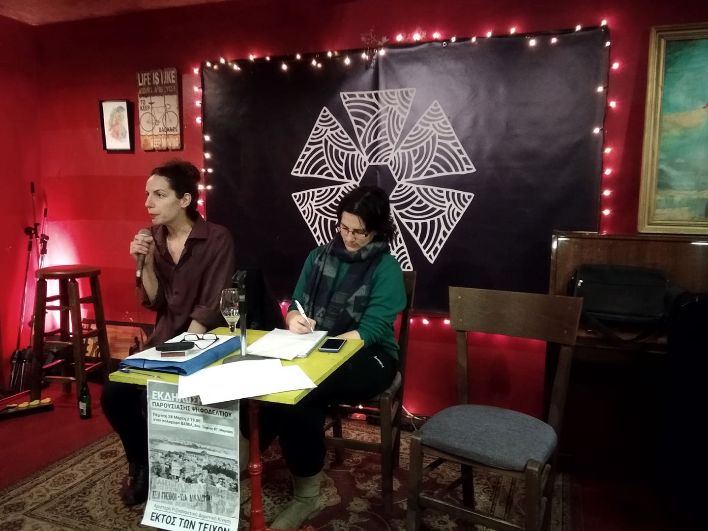 Με επιτυχία έλαβε χώρα η ανοιχτή εκδήλωση παρουσίασης ψηφοδελτίου και εκλογής του επικεφαλής της Αριστερής Ριζοσπαστικής Δημοτικής Κίνησης Μαρουσιού “Εκτός των Τειχών” στις 28/3 στον πολυχώρο Βαβέλ. Παρουσία δεκάδων αγωνιστριών και αγωνιστών της περιοχής, ο δημοτικός σύμβουλος Τάσος Σπυρόπουλος και ο υποψήφιος δήμαρχος Δημήτρης Πολυχρονιάδης παρουσίασαν το φάσμα των αγώνων στους οποίους έχει παρέμβει και πρωτοστατήσει η Κίνηση, ένα φάσμα ευρύ τόσο στο περιεχόμενο όσο και στο χρόνο: η Κίνηση “Εκτός των Τειχών” ιδρύθηκε το 2003 και είναι η αρχαιότερη δημοτική κίνηση του Μαρουσιού, ενώ συμμετέχει αδιάλειπτα στις εκλογές με το ίδιο όνομα και τις ίδιες αρχές από το 2006.