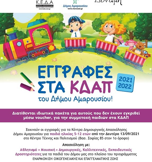 Ξεκίνησαν από τη Δευτέρα 13 Σεπτεμβρίου 2021 οι εγγραφές για τα Κέντρα Δημιουργικής Απασχόλησης του Δήμου Αμαρουσίου (ΚΔΑΠ), στο Κέντρο Τέχνης και Πολιτισμού (Βασ. Σοφίας 85, Μαρούσι, στον 1ο όροφο).