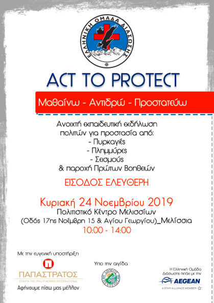 Το“Act to Protect” είναι ένα πρόγραμμα που υλοποιείται από την Ελληνική Ομάδα Διάσωσης με την ευγενική υποστήριξη της Παπαστράτος. Το πρόγραμμα περιλαμβάνει την διεξαγωγή 25 ενημερωτικών ανοιχτών ημερίδων, ενώ η διάρκειά του είναι επτά μήνες, με έναρξη τον Μάιο.