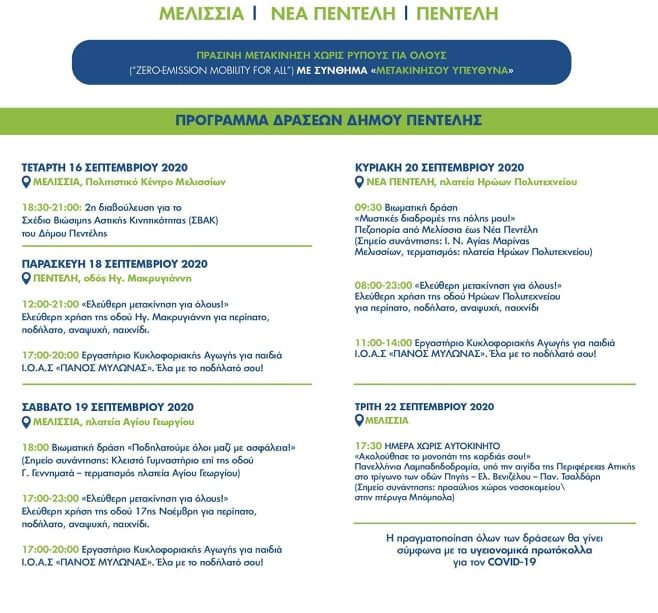 Παρόλη τη φετινή κατάσταση λόγω του κορωνοϊού COVID-19, ο Δήμος Πεντέλης θα συμμετέχει πιο ενεργά από κάθε άλλη χρονιά στην εκστρατεία, οργανώνοντας δράσεις ενημέρωσης, βιωματικές υπαίθριες δράσεις, όπως ποδηλασία και περπάτημα, καθώς και εκπαιδευτικό εργαστήριο κυκλοφοριακής αγωγής για παιδιά, τηρώντας ασφαλώς τα μέτρα προστασίας της δημόσιας υγείας και τις οδηγίες του ΕΟΔΥ και του Υπουργείου Υγείας.