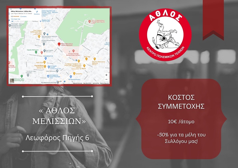 Ο “ΑΘΛΟΣ ΜΕΛΙΣΣΙΩΝ” πιστός στην ενδυνάμωση των γυναικών και την προώθηση της προστασίας τους μέσω της αυτοάμυνας διοργανώνει το ετήσιο Σεμινάριο Αυτοάμυνας Γυναικών που θα διεξαχθεί το Σάββατο 26/02 στις 13:00-15:00 .Τηρώντας όλα τα υγειονομικά πρωτόκολλα και μέτρα ασφαλείας κατά της πανδημίας covid-19,σας προσκαλεί να συμμετάσχετε και εσείς στη δράση του.