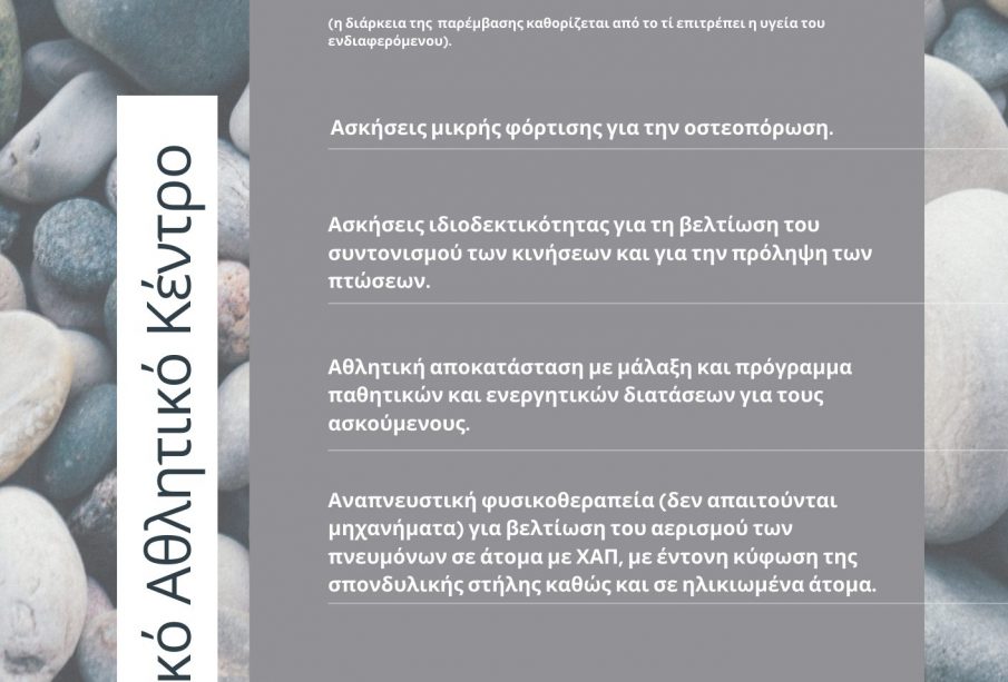 - Αθλητική αποκατάσταση με μάλαξη και πρόγραμμα παθητικών και ενεργητικών διατάσεων για τους ασκούμενους.