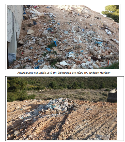 Στο χώρο (δείτε το σημείο στον σύνδεσμο: Τριβείο Μουζάκη) αποτίθενται διαχρονικά προϊόντα κατεδαφίσεων – και όχι μόνο – από τους γνωστούς / αγνώστους διαχρονικούς δημοτικούς εργολάβους, με φορτηγά χωρίς αριθμούς κυκλοφορίας, που κατά τα φαινόμενα μάλλον εμπλέκονται και στις πρόσφατες επιχώσεις στο ΣΜΑ Μελισσίων.