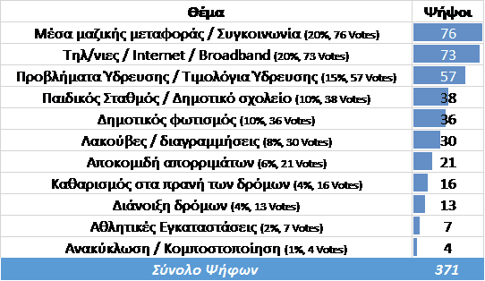 Η πρώτη ανάγνωση των αποτελεσμάτων φανερώνει τις αδυναμίες της περιοχής, αλλά καταδεικνύει επίσης την ευαισθητοποίηση των κατοίκων γύρω από θέματα περιβάλλοντος, όπως διαχείρισης των απορριμμάτων κτλ. Τα βασικά θέματα που απασχολούν την πλειοψηφία των συνεταίρων είναι κατά σειρά σπουδαιότητας: