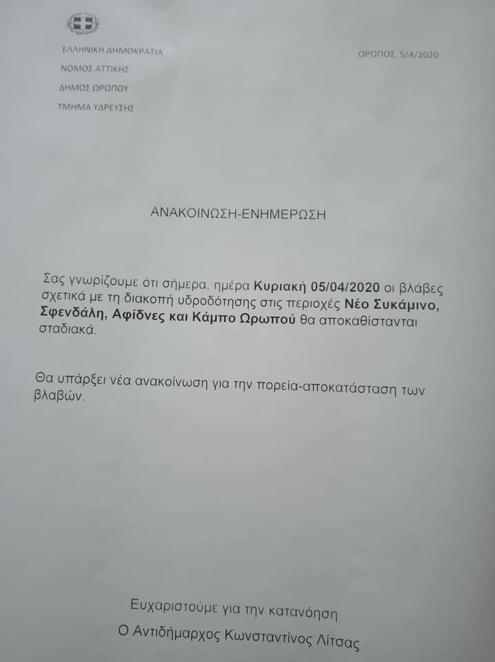 Χωρίς νερό Συκάμινο, Σφενδάλη, Αφίδνες και Κάμπος Ωρωπού