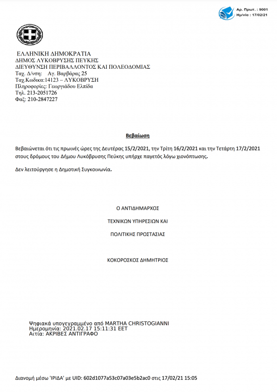 Με το έγγραφο αυτό βεβαιώνεται ότι τις πρωινές ώρες της Δευτέρας 15/2/2021, την Τρίτη 16/2/2021 και την Τετάρτη 17/2/2021 στους δρόμους του Δήμου Λυκόβρυσης Πεύκης υπήρχε παγετός λόγω χιονόπτωσης, ενώ δεν λειτούργησε η Δημοτική Συγκοινωνία.