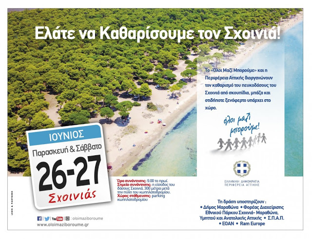 Την Παρασκευή 26 και το Σάββατο 27 Ιουνίου διοργανώνεται διήμερη δράση καθαρισμού του Εθνικού Πάρκου Σχινιά – Μαραθώνα από την Περιφέρεια Αττικής σε συνεργασία με το ΣΚΑΙ και το «ΟΛΟΙ ΜΑΖΙ ΜΠΟΡΟΥΜΕ».