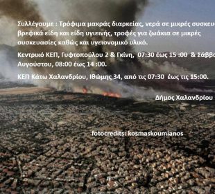 Ο Δήμος Χαλανδρίου καλεί τους κατοίκους και τους φορείς της πόλης μας να συνδράμουν στην προσπάθεια συγκέντρωσης βοήθειας για τους πληγέντες από ...Δείτε ποιες περιοχές δεν έχουν νερό λόγω της πυρκαγιάς