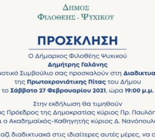 Να προστατεύσουν το κύρος της Τοπικής Αυτοδιοίκησης Ανακοίνωση επικεφαλής δημοτικών κινήσεων του Βόρειου Τομέα. 27.02.2021 Είδε πρόσφατα το φως τη δημοσιότητας δελτίο ...Κοπή πίτας Δήμου Φιλοθέης-Ψυχικού το Σάββατο με βραβεύσεις Παυλόπουλου και Νανόπουλου
