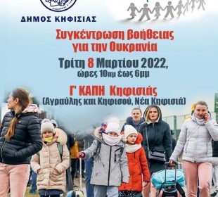 Συγκέντρωση βοήθειας για την Ουκρανία Τρίτη 8 Μαρτίου 2022, ώρες 10πμ έως 6μμ Γ’ ΚΑΠΗ Κηφισιάς (Αγραύλης και Κηφισού Νέα Κηφισιά) Ο Δήμος ...Δήμος Κηφισιάς: Σχέδιο Δράσης για την Ένταξη της Ισότητας των Φύλων “2022-2023”