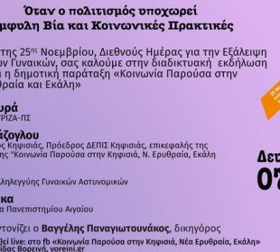 Με την ευκαιρία της 25ης Νοεμβρίου, Διεθνούς Ημέρας για την Εξάλειψη της Βίας κατά των Γυναικών, η δημοτική παράταξη «Κοινωνία Παρούσα στην Κηφισιά, ...Δημοτικό συμβούλιο μέσω τηλεδιάσκεψης στην Κηφισιά την Τετάρτη 1/12/21