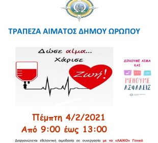 Η σχετική ανακοίνωση: Σε μία κρίσιμη περίοδο που οι τράπεζες αίματος της χώρας έχουν τεράστιες ανάγκες, ο Δήμος Ωρωπού θα πραγματοποιήσει εθελοντική ...