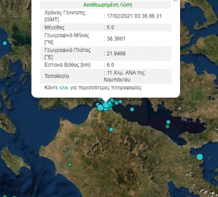 Σεισμική δόνηση μεγέθους 4.1 βαθμών της κλίμακας Ρίχτερ σημειώθηκε στις 09:30 το πρωί της Τρίτης 09-02-2021. Το επίκεντρο της δόνησης είναι 32 ...Aυτοψία επιθεωρητών περιβάλλοντος στο Κέντρο Υπερυψηλής Τάσης του ΑΔΜΗΕ στα Νεόκτιστα Ασπροπύργου