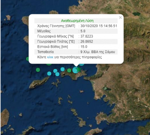 Magnitude Mw 7.0 Region DODECANESE ISLANDS, GREECE Date time 2020-10-30 11:51:25.7 UTC Location 37.91 N ; 26.84 E Depth 10 km Distances ...Μεγάλος σεισμός 6.7 Ρίχτερ στη Σάμο κούνησε όλη την Ελλάδα
