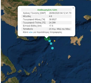Νέα σεισμική δόνηση μεγέθους 4.6 βαθμών της κλίμακας Ρίχτερ σημειώθηκε στις 07:12 το πρωί της Δευτέρας 28-09-2020. Το επίκεντρο της δόνησης είναι ...Ισχυρός σεισμός 5,2 Ρίχτερ στη θαλάσσια περιοχή του Αγίου Όρους