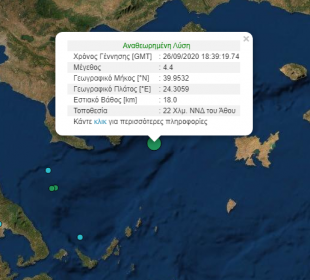 Σεισμική δόνηση μεγέθους 4.4 βαθμών της κλίμακας Ρίχτερ σημειώθηκε στις 21:39 το βράδυ του Σαββάτου 26-09-2020. Το επίκεντρο της δόνησης είναι 22 ...Ο καύσωνας της θάλασσας και οι καταστροφικές του συνέπειες