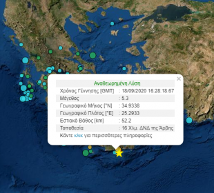 Σεισμική δόνηση μεγέθους 5.3 βαθμών της κλίμακας Ρίχτερ σημειώθηκε στις 19.28 το απόγευμα της Παρασκευής 18-09-2020. Το επίκεντρο της δόνησης είναι : ...