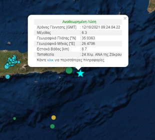 Ισχυρή σεισμική δόνηση μεγέθους 6.3 βαθμών της κλίμακας Richter σημειώθηκε σήμερα 12 Οκτωβρίου 2021 και ώρα 12.24 στην Κρήτη. Σύμφωνα με το Γεωδυναμικό Ινστιτούτο ...Ισχυρός σεισμός 6.3 Ρίχτερ στην Κρήτη. Προειδοποίηση για μικρό τσουνάμι