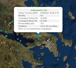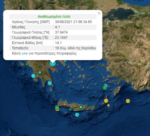 Σεισμική δόνηση μεγέθους 4.1 βαθμών της κλίμακας Ρίχτερ σημειώθηκε στις 00:06 την νύχτα, ξημέρωμα, της Τρίτης 31-08-2021. Το επίκεντρο της δόνησης είναι ...To 1/3 των δασών της Εύβοιας κάηκε από την πρόσφατη πυρκαγιά