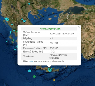 Σεισμική δόνηση μεγέθους 4.1 βαθμών της κλίμακας Ρίχτερ σημειώθηκε στις 22:46 το βράδυ της Παρασκευής 02-07-2021. Το επίκεντρο της δόνησης είναι 19 ...