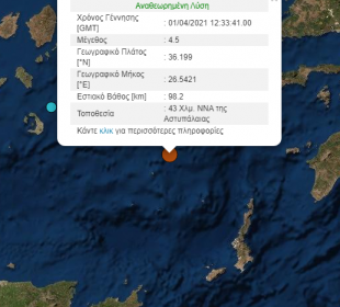 Σεισμική δόνηση μεγέθους 4.5 βαθμών της κλίμακας Ρίχτερ σημειώθηκε το μεσημέρι της Πέμπτης 1-04-2021. Το επίκεντρο της δόνησης είναι 43 χλμ νότια-νοτιοανατολικά ...17.000 είδη ζώων και φυτών στον νέο Κόκκινο Κατάλογο