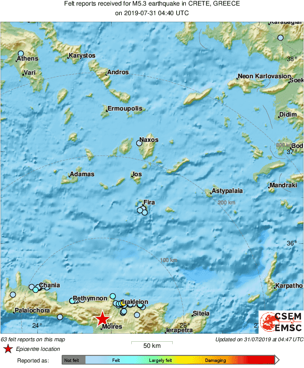Σεισμική δόνηση μεγέθους 5.3 βαθμών της κλίμακας Ρίχτερ σημειώθηκε στις 07.39 το πρωί της Τετάρτης 31-07-2019. Το επίκεντρο της δόνησης είναι  31 χλμ Νότια – Νοτιοανατολικά του Ηρακλείου Κρήτης. Το εστιακό βάθος μετρήθηκε στα 120 χλμ.