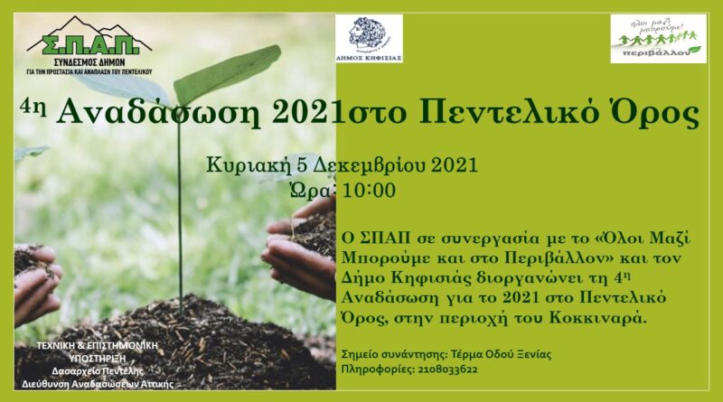 Ο Σύνδεσμος Δήμων για την Προστασία και Ανάπλαση του Πεντελικού (ΣΠΑΠ) συνεχίζει δυναμικά τις δράσεις αναδάσωσης βοηθώντας με τον καλύτερο δυνατό τρόπο στην ανάπλαση και αποκατάσταση του φυσικού περιβάλλοντος στο Πεντελικό Όρος. Ο Σύνδεσμος για την Προστασία και Ανάπλαση του Πεντελικού (ΣΠΑΠ) σε συνεργασία με το «Όλοι Μαζί Μπορούμε και στο Περιβάλλον» και τον Δήμο Κηφισιάς διοργανώνει την 4η δράση Αναδάσωσης που θα πραγματοποιηθεί την Κυριακή 5 Δεκεμβρίου 2021 στις 10 π.μ. στην περιοχή του Κοκκιναρά.