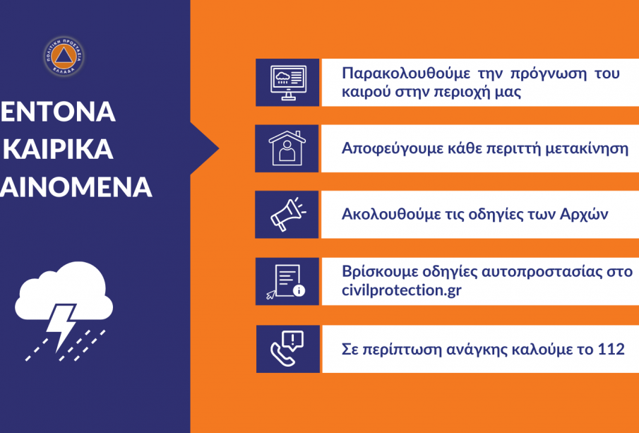 Για περισσότερες πληροφορίες και οδηγίες αυτοπροστασίας από τα έντονα καιρικά φαινόμενα, οι πολίτες μπορούν να επισκεφθούν την ιστοσελίδα της Γενικής Γραμματείας Πολιτικής Προστασίας στην ηλεκτρονική διεύθυνση www.civilprotection.gr.