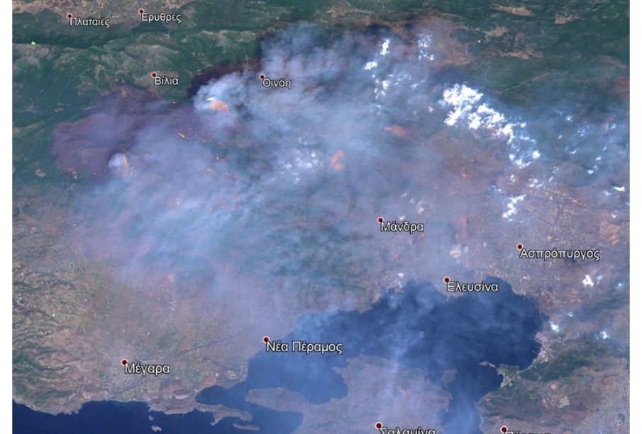 Εικόνα 1: Δορυφορική εικόνα της δασικής πυρκαγιάς στα Βίλια από τον δορυφόρο Sentinel-2 , την Τετάρτη 18 Αυγούστου 2021, όπου διακρίνονται οι ενεργές εστίες της πυρκαγιάς και ο σχηματισμός πυροσωρείτη (pyroCu).