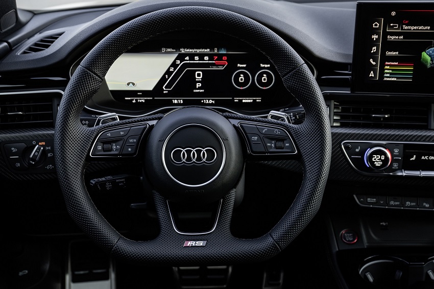Επιπλέον, εμφανίζονται η επιτάχυνση και οι χρόνοι γύρου σε πίστα. Το πεπλατυσμένο δερμάτινο τιμόνι RS, πλήρως διάτρητο, με νέα paddles αλουμινίου, διαθέτει επίσης το κουμπί “RS MODE”, που χρησιμοποιεί ο οδηγός για να επιλέξει mode λειτουργίας “RS1” ή “RS2” και το οποίο ανοίγει αυτόματα τις ειδικές οθόνες RS στο Audi virtual cockpit. Διαθέσιμο προαιρετικά και head-up display, για την εμφάνιση πολλών λειτουργιών στο παρμπρίζ του αυτοκινήτου.