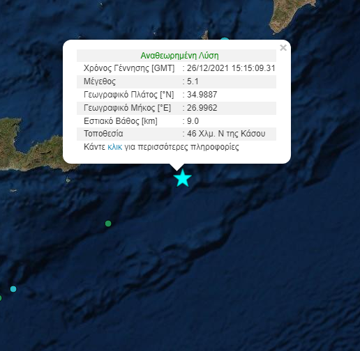 Σεισμική δόνηση μεγέθους 5.1 βαθμών της κλίμακας Ρίχτερ σημειώθηκε στις 17:15 το απόγευμα της Κυριακής 26-12-2021. Το επίκεντρο της δόνησης είναι 46 χλμ νότια της Κάσου. Το εστιακό βάθος μετρήθηκε στα 9 χλμ.