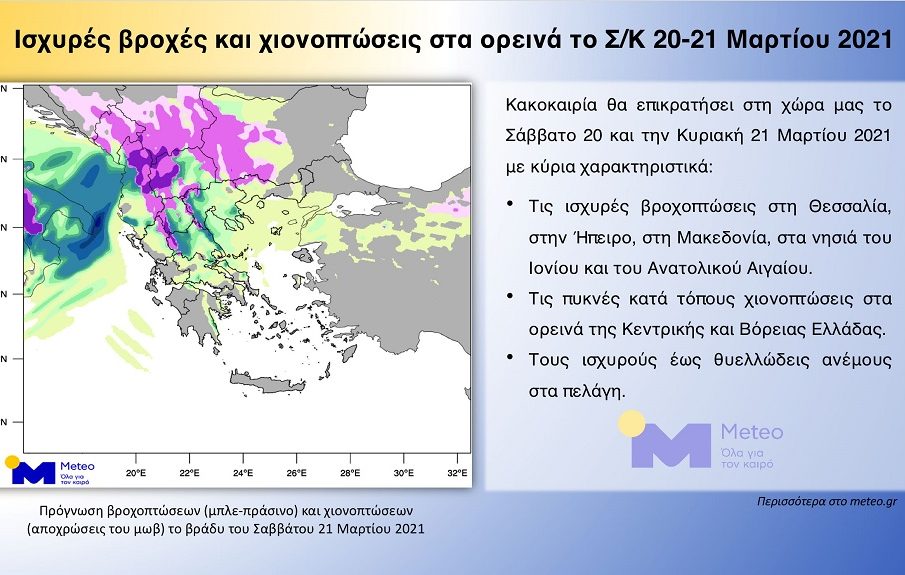 Ο συνδυασμός χαμηλών πιέσεων στην Κεντρική Μεσόγειο με τις υψηλότερες πιέσεις στα Βόρεια Βαλκάνια θα οδηγήσει στην επιδείνωση του καιρού στη χώρα μας το Σάββατο 20 Μαρτίου 2021. Τα κύρια χαρακτηριστικά του καιρού το Σάββατο 20 και την Κυριακή 21/03 θα είναι οι ισχυρές βροχοπτώσεις στα κεντρικά και βόρεια τμήματα, οι χιονοπτώσεις στα ορεινά και σε περιοχές με χαμηλό υψόμετρο στη Δυτική Μακεδονία και οι ισχυροί έως θυελλώδεις άνεμοι στα πελάγη. Παράλληλα ένα βαρομετρικό χαμηλό από την περιοχή της Σύρτης κινούμενο προς τη χώρα μας θα είναι υπεύθυνο για τη μεταφορά μεγάλης ποσότητας αφρικανικής σκόνης την Κυριακή 21/03 με αποτέλεσμα την εκδήλωση λασποβροχών κυρίως στη Δυτική Ελλάδα.