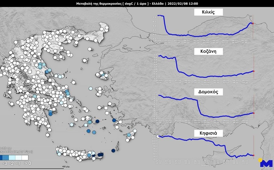 Καταγραφές της απότομης πτώσης της θερμοκρασίας κατά το πέρασμα του ψυχρού μετώπου στις 7-8 Φεβρουαρίου του 2022