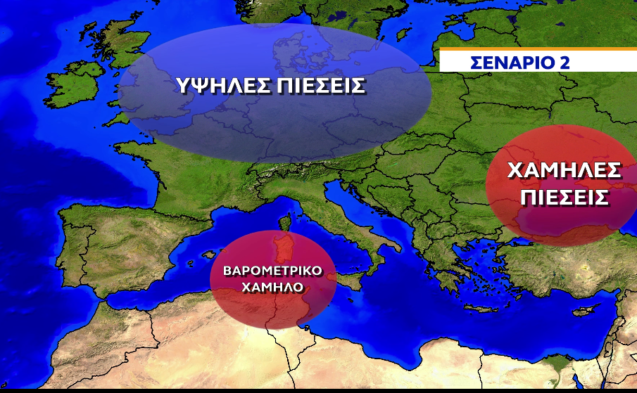 Σύμφωνα με το σενάριο αυτό ισχυρό πεδίο υψηλών βαρομετρικών πιέσεων εμφανίζεται να καλύπτει την βόρεια Ευρώπη με τάσεις εξάπλωσης προς τα βορειοδυτικά τμήματα και οι οποίες υψηλές πιέσεις φαίνεται να συνδυάζονται με βαθύ βαρομετρικό χαμηλό προς τη Μαύρη θάλασσα. Η όλη αυτή εξέλιξη θα ωθήσει πολικές αέριες μάζες (μπλε βέλη) προς τη νότια Ευρώπη σχηματίζοντας ένα βαρομετρικό χαμηλό στα δυτικά θαλάσσια τμήματα της χώρας μας. Αυτό το σενάριο θα οδηγήσει σε βαρυχειμωνιά τη χώρα μας με τα χιόνια για άλλη μία φορά να επηρεάζουν ακόμη και πεδινές περιοχές και τον υδράργυρο να προσεγγίζει ακόμη και πολλούς βαθμούς κάτω από το μηδέν ιδιαίτερα προς τα βόρεια που σημαίνει ισχυρός παγετός πιθανόν και ολικός.