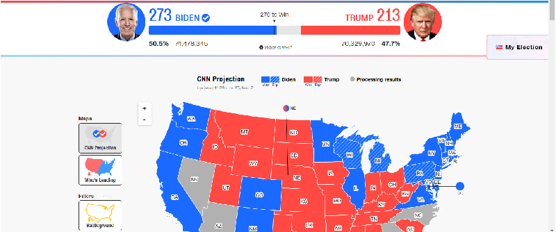Ο Τζο Μπάιντεν κέρδισε την Πενσιλβάνια και τους 20 εκλέκτορες της πολιτείας, οπότε και εκλέγεται Πρόεδρος των Ηνωμένων Πολιτειών. Επίσης προηγείται σε Νεβάδα και Τζόρτζια.