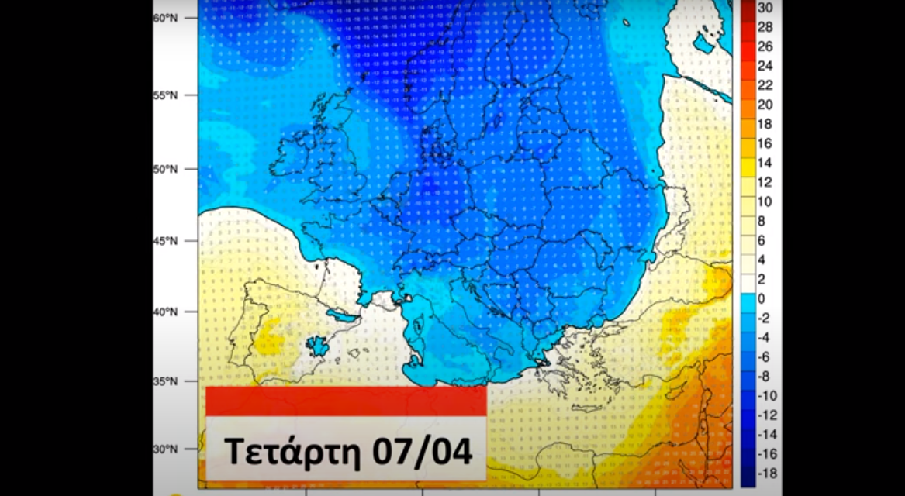 Ψυχρές αέριες μάζες από την Βορειοδυτική Ευρώπη κινούνται προς τη Βαλκανική Χερσόνησο και τη χώρα μας με αποτέλεσμα την πτώση της θερμοκρασίας από το βράδυ της Τετάρτης 07/04. Η νέα ψυχρή εισβολή οφείλεται στο συνδυασμό ενός βαθέως χαμηλού στην περιοχή της Βόρειας Σκανδιναβίας και των έντονα αντικυκλωνικών συνθηκών δυτικά της Ιρλανδίας. Ο εν λόγω συνδυασμός έχει ως αποτέλεσμά την ενισχυμένη ροή ψυχρών αερίων μαζών προς τη Νοτιοανατολική Ευρώπη. Στο σχετικό χάρτη φαίνονται οι θέσεις του χαμηλού και του αντικυκλώνα καθώς και η ισχυρή ροή των αερίων μαζών στην περιοχή μεταξύ των δύο βαρομετρικών συστημάτων.