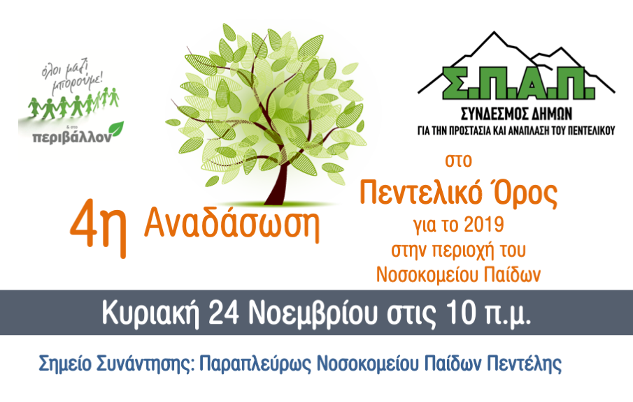 Ο Σύνδεσμος Δήμων για την Προστασία και Ανάπλαση του Πεντελικού (Σ.Π.Α.Π) και το «Όλοι Μαζί Μπορούμε και στο Περιβάλλον», συνεχίζουν την προσπάθεια για την αποκατάσταση του φυσικού περιβάλλοντος στο Πεντελικό όρος, με την 4η Εθελοντική Δράση Αναδάσωσης για το 2019, που θα πραγματοποιηθεί την Κυριακή 24 Νοεμβρίου 2019 στις 10 π.μ. στην περιοχή του Νοσοκομείου Παίδων Πεντέλης.