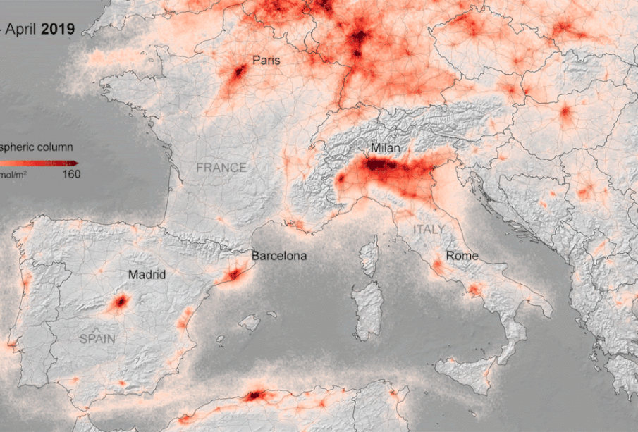 Οι νέες εικόνες δείχνουν τις συγκεντρώσεις διοξειδίου του αζώτου από τις 13 Μαρτίου έως τις 13 Απριλίου 2020, σε σύγκριση με τις μέσες συγκεντρώσεις Μαρτίου-Απριλίου του 2019. Η Μαδρίτη, το Μιλάνο και η Ρώμη σημείωσαν μείωση περίπου 45%, ενώ το Παρίσι σημείωσε δραματική πτώση 54% – συμπίπτοντας με τα αυστηρά μέτρα καραντίνας που εφαρμόζονται σε όλη την Ευρώπη.