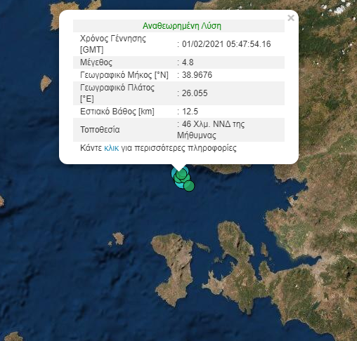 Ισχυρή σεισμική δόνηση μεγέθους 4.9 βαθμών της κλίμακας Ρίχτερ σημειώθηκε στις 07:46 το πρωί της Δευτέρας 01-02-2021. Το επίκεντρο της δόνησης είναι 46 χλμ δυτικά-νοτιοδυτικά της Μυτιλήνης. Το εστιακό βάθος μετρήθηκε στα 15 χλμ.