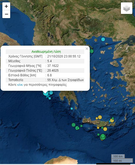 Σεισμική δόνηση μεγέθους 5.4 βαθμών της κλίμακας Ρίχτερ σημειώθηκε στις 02:00 το πρωί της Πέμπτης 22-10-2020. Το επίκεντρο της δόνησης είναι 55 χλμ δυτικά των Στροφάδων. Το εστιακό βάθος μετρήθηκε στα 6.8 χλμ.