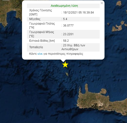 Ισχυρή σεισμική δόνηση μεγέθους 5.4 βαθμών της κλίμακας Ρίχτερ σημειώθηκε στις 07:16 το πρωί του Σαββάτου 18-12-2021. Το επίκεντρο της δόνησης είναι 23 χλμ βόρεια -βορειοδυτικά των Αντικυθήρων. Το εστιακό βάθος μετρήθηκε στα 58 χλμ.