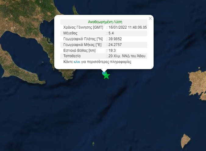 Σεισμική δόνηση μεγέθους 5.4 βαθμών της κλίμακας Ρίχτερ σημειώθηκε στις 13:48 σήμερα Κυριακή 16-01-2022. Το επίκεντρο της δόνησης είναι 20 Χλμ. ΝΝΔ του Άθου. Το εστιακό βάθος μετρήθηκε στα 19,3 χλμ.