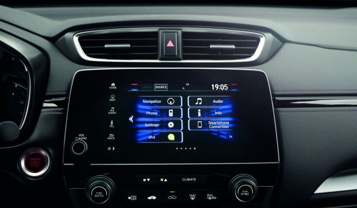 Η CR-V e:HEV διαθέτει κεντρική οθόνη αφής πέραν της διεπαφής Driver Information Interface (DII) 7 ιντσών. Η διάταξη των χειριστηρίων, με μία σειρά φυσικών μπουτόν και οργάνων κάτω από την οθόνη, επιτρέπει την εύκολη ρύθμιση των συστημάτων θέρμανσης, εξαερισμού και κλιματισμού (AC).