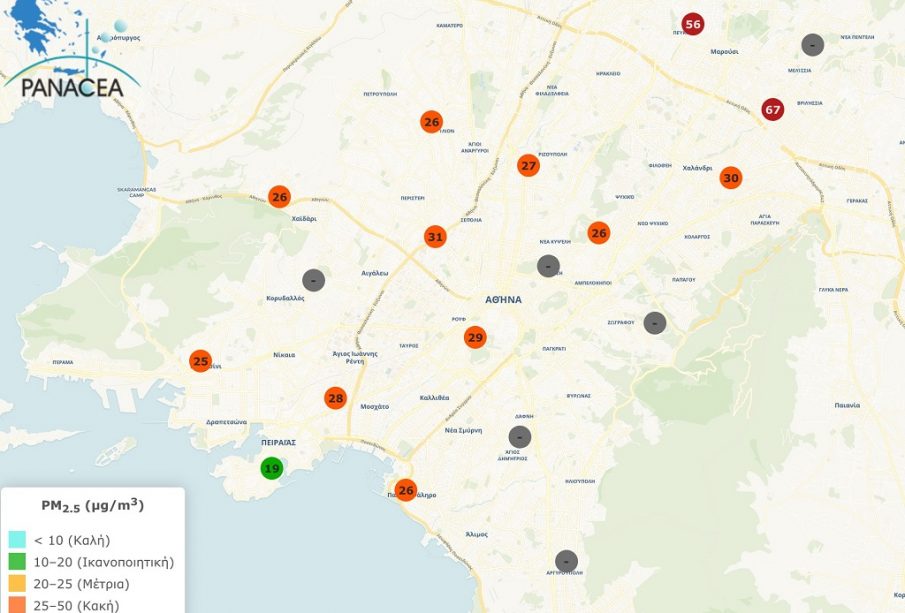 Ο χάρτης παρουσιάζει τα ωριαία επίπεδα συγκεντρώσεων των σωματιδίων PM2.5 (οι τιμές είναι βαθμονομημένες και ακριβείς). Τα στοιχεία προέρχονται από το δίκτυο αισθητήρων του Ινστιτούτου Ερευνών Περιβάλλοντος του Εθνικού Αστεροσκοπείου Αθηνών (ΙΕΠΒΑ/ΕΑΑ), που λειτουργεί στο πλαίσιο της Εθνικής Ερευνητικής Υποδομής ΠΑΝΑΚΕΙΑ της Γενικής Γραμματείας Έρευνας και Καινοτομίας και σε συνεργασία με την Περιφέρεια Αττικής.