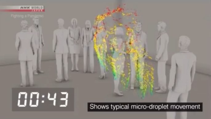 Τον τρόπο διασποράς του κορονοϊού μέσω των σταγονιδίων αναπαριστά βίντεο του ιαπωνικού τηλεοπτικού δικτύου NHK, το οποίο δημοσιεύσει επιστημονικά πειράματα για την ταχύτητα μετάδοσης του ιού μέσω του βήχα ή του φτερνίσματος.