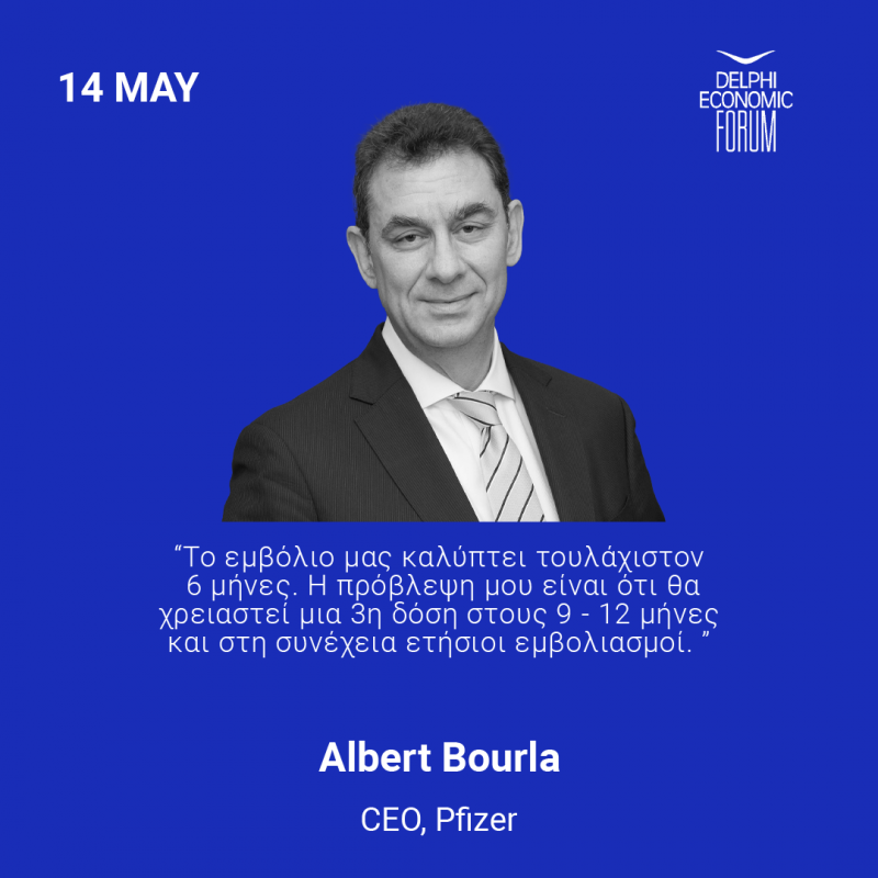 O Διευθύνων Σύμβουλος της Pfizer Άλμπερτ Μπουρλά συνομίλησε με την δημοσιογράφο Σία Κοσιώνη, για τα εμβόλια, τα φάρμακα και τις πατέντες των εμβολίων, στο πλαίσιο του 6ου Οικονομικού Φόρουμ των Δελφών, το οποίο τελεί υπό την Αιγίδα της Α.Ε. της Προέδρου της Δημοκρατίας, Κατερίνας Σακελλαροπούλου.