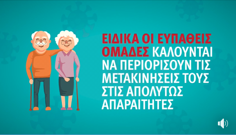 Νέο βίντεο ενημέρωσης για τον Κορονοϊό με έμφαση στις ευπαθείς ομάδες και σύσταση να περιορίσουν τις μετακινήσεις στις απολύτως απαραίτητες ειδικά για τους επόμενους δυο μήνες.