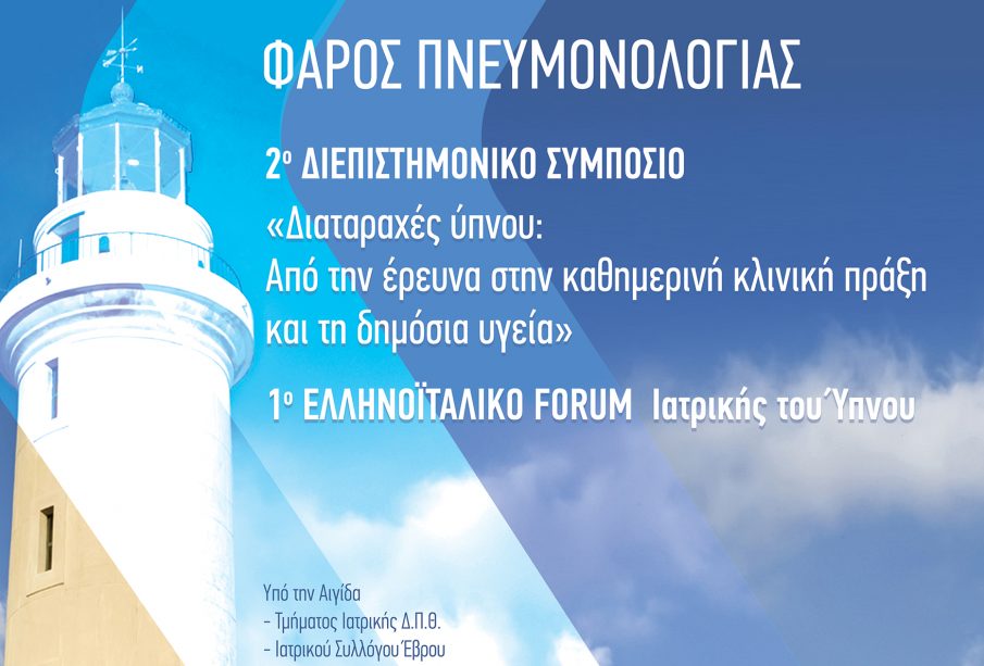 H Πανεπιστημιακή Πνευμονολογική Κλινική, το Πρόγραμμα Μεταπτυχιακών Σπουδών «Ιατρική του Ύπνου» του Τμήματος Ιατρικής του Δ.Π.Θ. και η Δημοκρίτεια Ιατρική Εταιρεία, διοργανώνουν το Συνέδριο «Φάρος Πνευμονολογίας 2020» – 2ο Διεπιστημονικό Συμπόσιο με θέμα «Διαταραχές ύπνου: Από την έρευνα στην καθημερινή κλινική πράξη και τη δημόσια υγεία» – 1ο ΕΛΛΗΝΟΪΤΑΛΙΚΟ FORUM «Ιατρική του Ύπνου», στην Αλεξανδρούπολη, στις 9-11 Οκτωβρίου 2020.