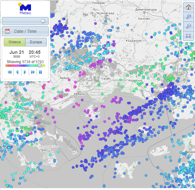 Έντονη κεραυνική δραστηριότητα συνόδευσε τις βροχές και τις καταιγίδες που σημειώθηκαν στην κεντρική και βόρεια χώρα την Κυριακή 21/06. Το σύστημα εντοπισμού κεραυνών «ΖΕΥΣ» του Εθνικού Αστεροσκοπείου Αθηνών κατέγραψε περίπου 1500 κεραυνούς, οι περισσότεροι εκ τον όποιων εντοπίζονται στην Κεντρική και Ανατολική Μακεδονία, στη Θράκη και στο Βόρειο Αιγαίο. Στο χάρτη που ακολουθεί φαίνεται τόσο η γεωγραφική κατανομή τους όσο και ο αριθμός κεραυνών που έπεσαν σε ηπειρωτικές και θαλάσσιες περιοχές έως τις 20:00 της Κυριακής 21/06.